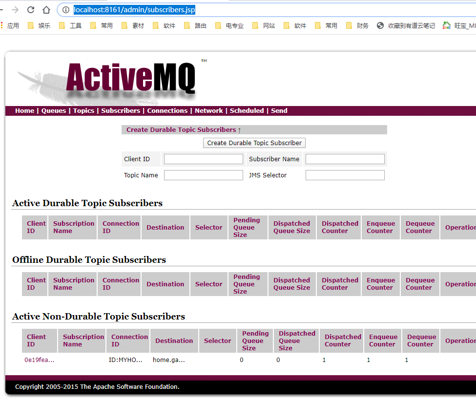 这个时候,我们就是需要做一个订阅,点击客户端的“subscribe”选项卡,使用默认设置点击“Subscribe”,我们将会创建一个订阅者,可以在网页http://localhost:8161/admin/subscribers.jsp 查看到已经有订阅者链接了。
