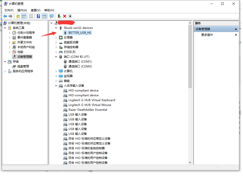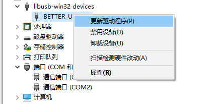 这里发现出现了一个类型为”libusb_win32_devices”的设备叫“BETTER_USB_HS”,这个时候我们需要在这个设备上点击右键: