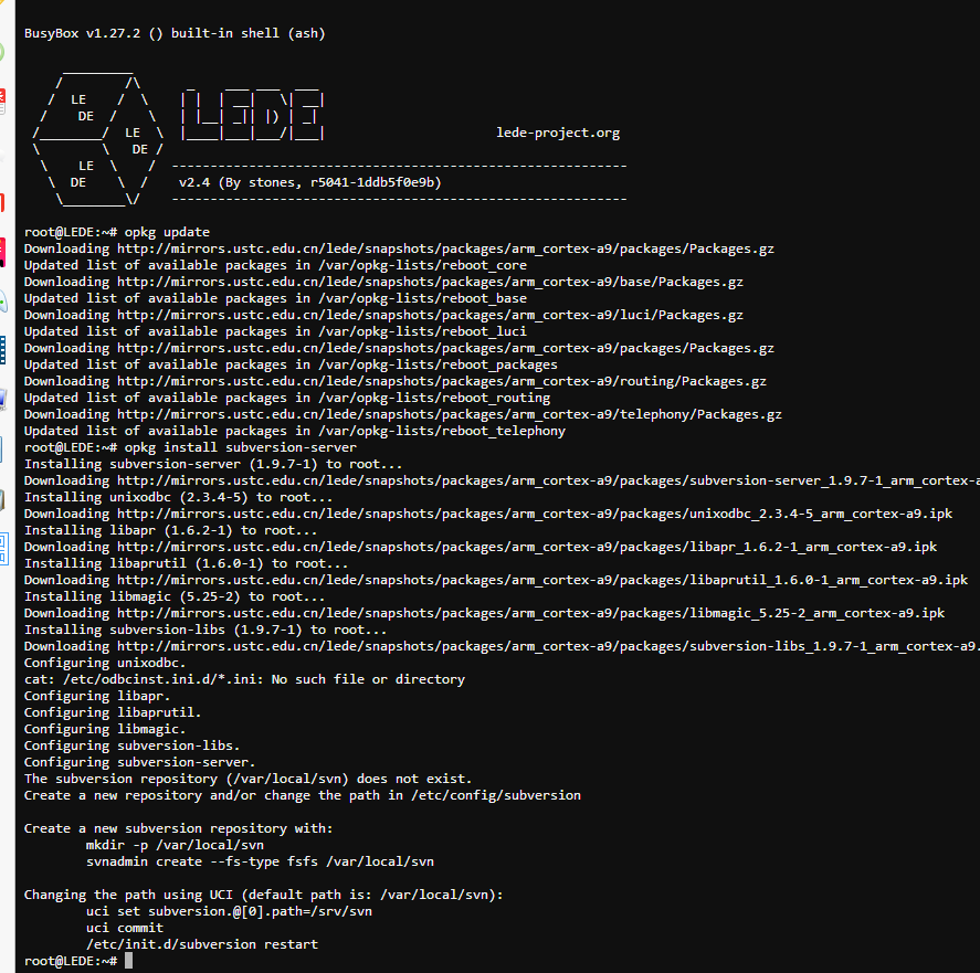 搜索svn相关字眼并没有结果,很烦!!搜索git倒是有,但是我的项目是建立在svn上,只能作罢。于是百度关键字“lede svn-server”,也没有合适的结果,后来想到lede是openwrt的衍生版,而openwrt时间长了,应该有大神移植的软件,然后换关键字“openwrt svn-server”,果然不出所望有合适的结果。搜到链接: